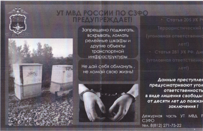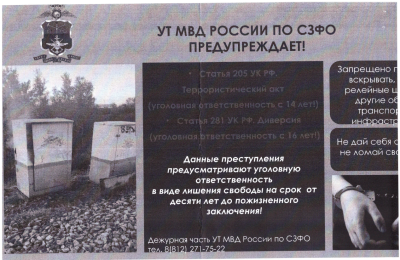 Управлением на транспорте МВД России по Северо-Западному федеральному округу в целях профилактики преступлений диверсионно-террористической направленности, связанных с незаконным вмешательством в деятельность объектов транспортной инфраструктуры, подготовлены профилактический видеоролик и памятка.